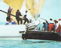 | Mandrake slips along in light airs during the 1991 World Cup in Japan, with Champosa VII and Juno V visible on port (Offshore magazine) |