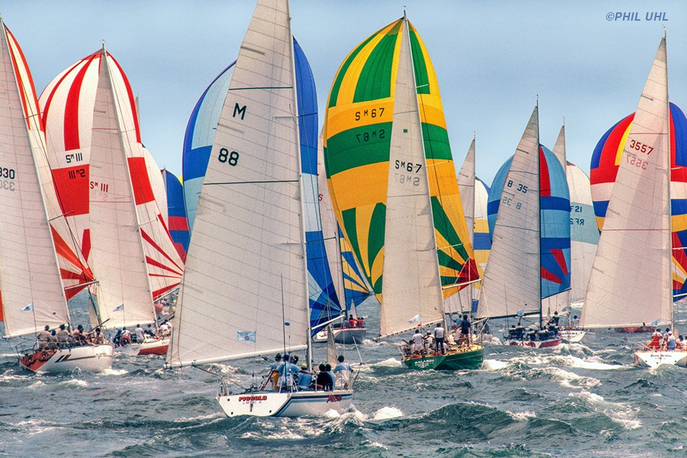 | A close-up view of the crew of Smackwater Jack at the start of the 1979 Sydney-Hobart race, with skipper and designer Paul Whiting in a red t-shirt to the left, and below, Smackwater Jack can just be seen to leeward and ahead of Bacardi (SM67) (photos Phil Uhl) |